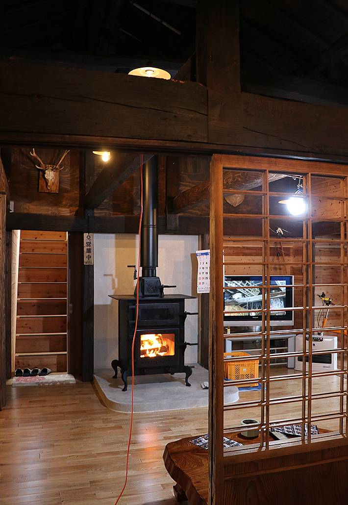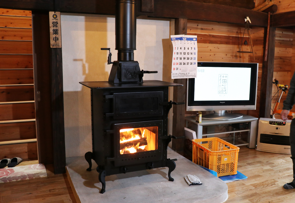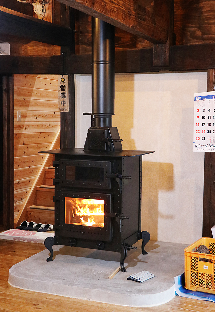 いつも賑やかにご近所さんがたくさん集まるお家に、薪ストーブを設置させていただきました。施主様が大きな広間の正面に、明るいグレーのシンプルな炉台をお作りになられており、黒の薪ストーブがより一層効果的に映えます。
