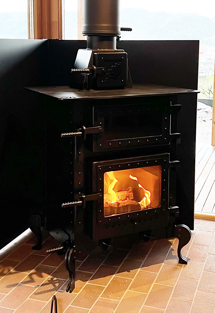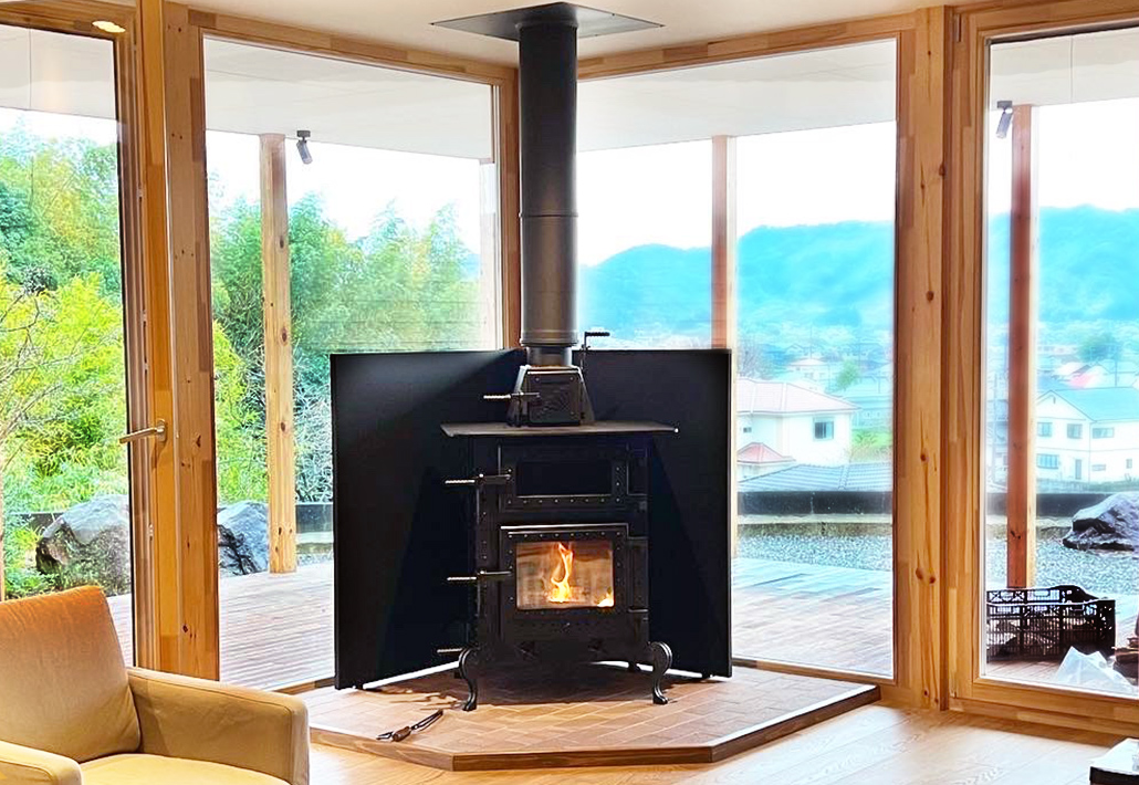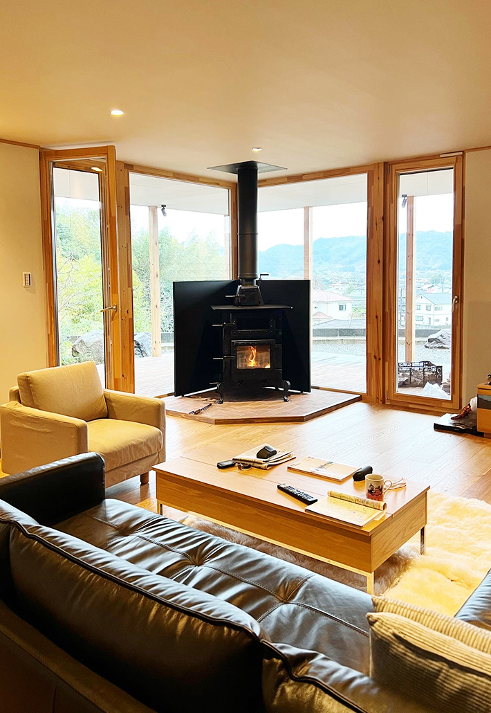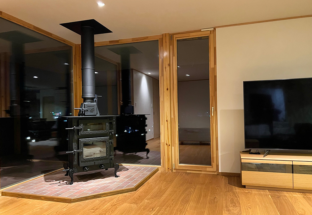 高台にあるこちらのお家は無音と言っても良いほど静かです。全面ガラスの大きな壁から見える美しい夜景。冬はそのガラスの前にアイアンのパテーション(遮熱壁)を設置して、真っ暗な空間に炎だけが浮かび上がるよにしています。薪のパチパチとはぜる音だけが聞こえ、ここだけがゆっくりとゆくりと贅沢な時間が流れているようです。