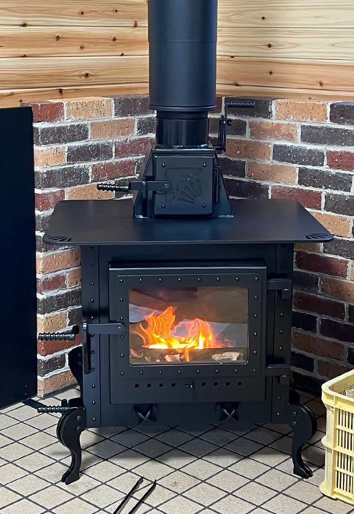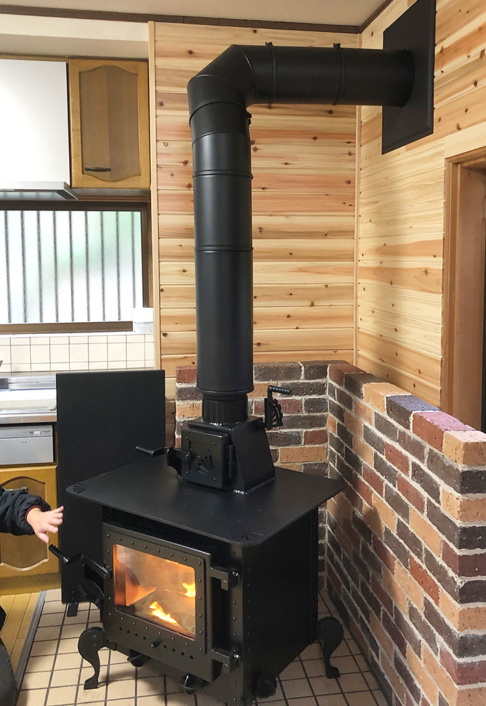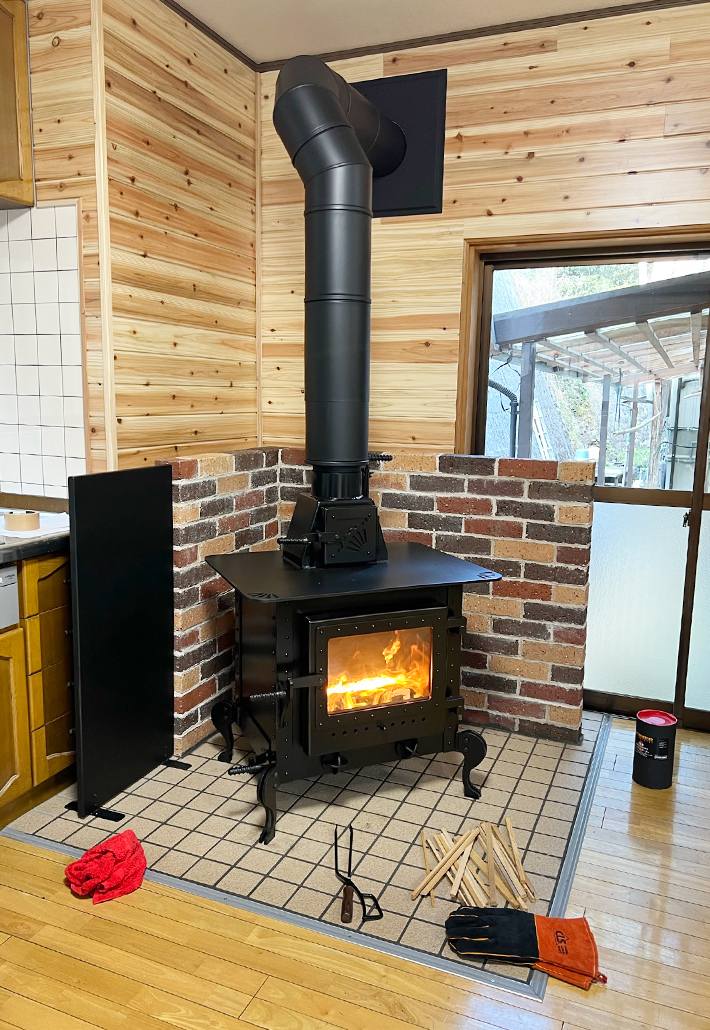 とてもお家が寒いということで、大きなお家のキッチンに薪ストーブを設置させていただきました。ただ大きなシステムキッチンがあるため十分な遮熱壁のスペースが確保できないので、薪ストーブをお使いの時期にレンガの遮熱壁の横に追加で使ってもらう遮熱の衝立(パテーション)を取り付けました。レンガの遮熱壁は施主様と息子さんと3人で作ったものです。