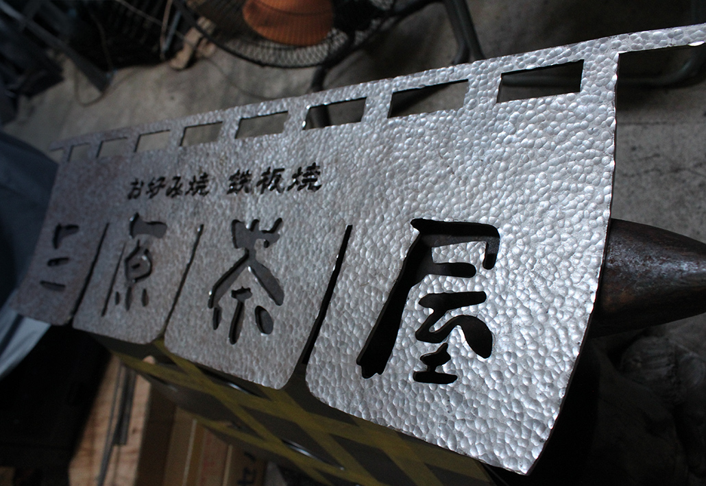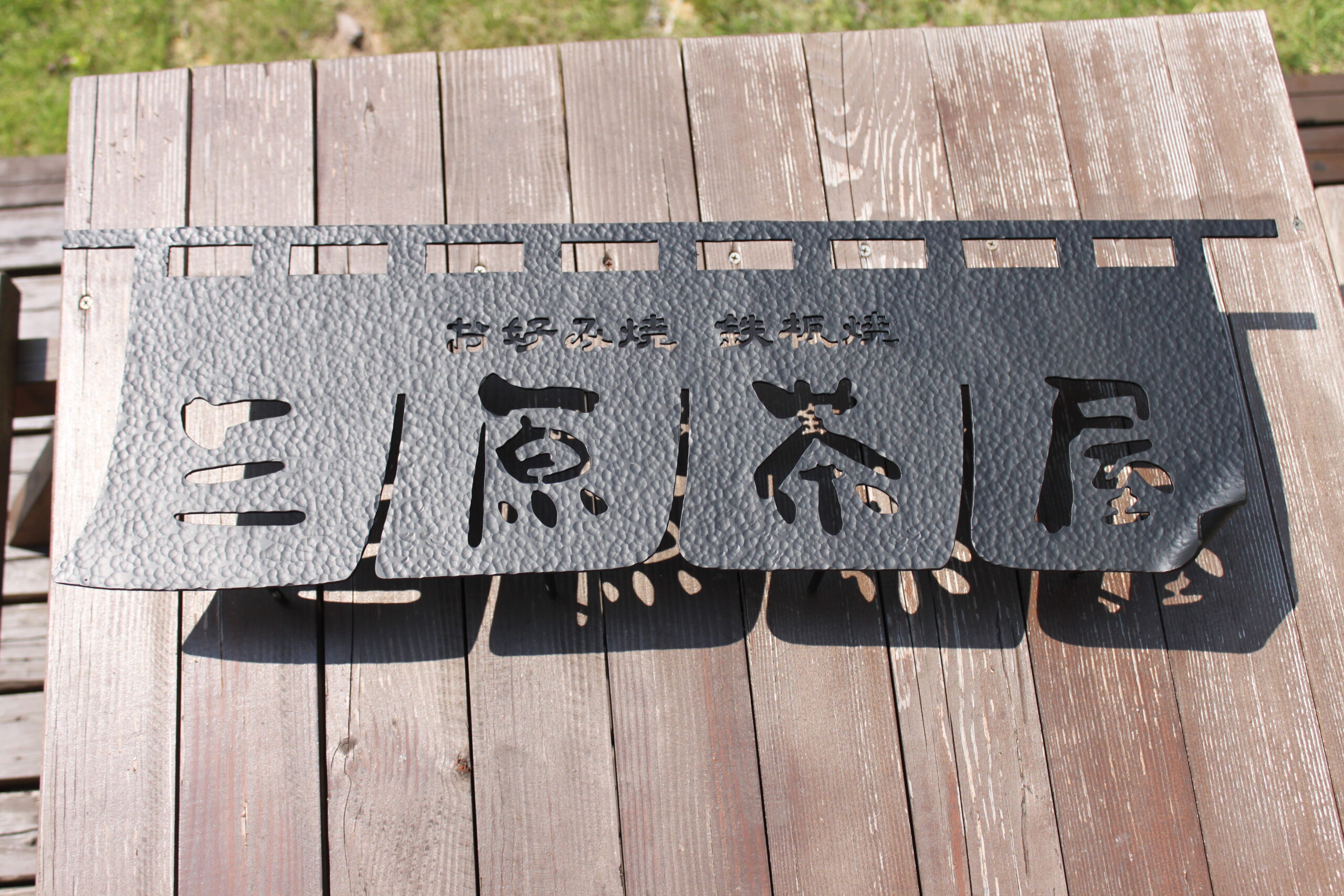 伝統的のれんをイメージした鉄製の看板です。鉄板表面をハンマーで叩いて凹凸つけた「ハンマートーン仕上げ」。独特の質感が生まれ、重厚感と温かみを感じさせる仕上がりにしました。のれんが少し風でめくれているように立体感つけたところもこだわっています。